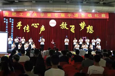 | 6月3日晚上,我院大学生发展辅导中心参加了由校党委学工部主办,数学学院大学生发展辅导中心承办的我校第七届手语合唱比赛,荣获“三等奖”和“最佳组织奖”,展示了我院学子青春活力的精神风貌。 我院手语合唱参赛节目是《一次就好》,同学们用精确的音准和整齐一致的手语动作,展现了现实中的迷茫与烦恼,更突出表达了对梦想和未来的永不放弃。 本次参赛的24名演员均来自我院英语专业2015级学生,并配有5名2014级学生指导。历经3个星期的集训,同学们放弃休息和娱乐的时间,全身心地投入此次以“手传心声?放飞梦想”为主题的手语合唱比赛。同学们团结合作,克服困难,反复练习手语动作和面部表情,表达当代大学生乐观向上的心理状态,最终以优秀的表现获得认可和赞扬。