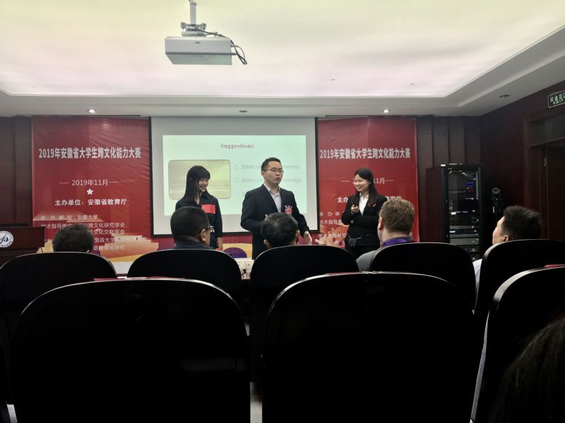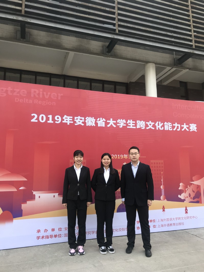 2019年安徽省大学生跨文化能力大赛于11月9-10日在安徽大学成功举办,来自全省25所高校的参赛团队展开激烈角逐。我校选派的跨文化能力团队首次参赛,并在我院刘丽老师的精心指导下获得二等奖的好成绩。展现了我校大学生过硬的语言技能和跨文化能力,凸显了我校英语教学改革的成效。三位参赛队员分别是2016级英语(国际贸易)专业的史晓丹、2018级微电子科学与工程专业的崇雯玥和2018级高分子材料与工程专业的郭魏楠。