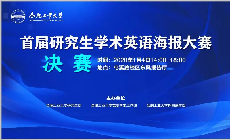 1月4日,我校首届研究生学术英语海报大赛决赛在屯溪路校区东风报告厅举行。研究生院副院长李军鹏、主管杨依忠,72886必赢欢迎光临书记胡丹、院长韩江洪、副院长唐军等出席决赛活动。本次大赛由研究生院、党委学生工作部和72886必赢欢迎光临共同主办。