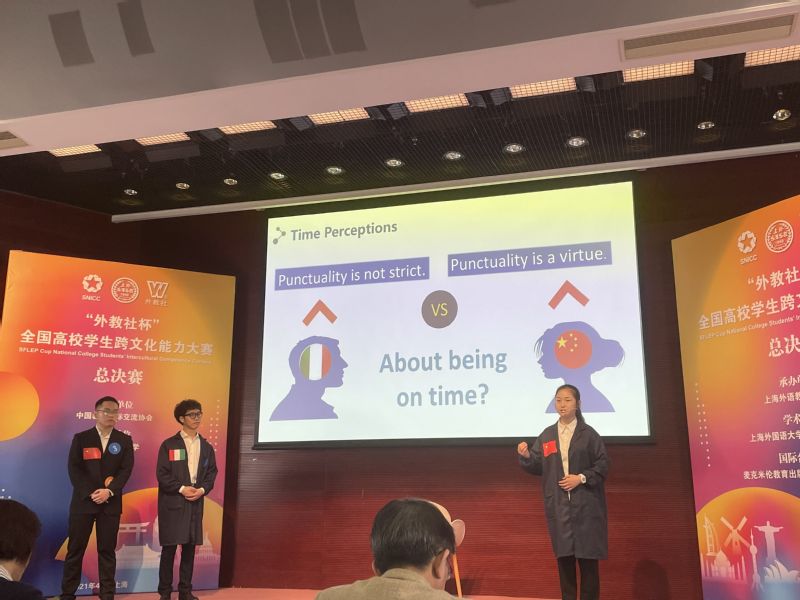 “外教社杯”全国高校学生跨文化能力大赛由中国教育国际交流协会指导,以习近平新时代中国特色社会主义思想为指导,以“坚定文化自信、增进国际理解”为主题,专注打造高校学生语言文化类一流竞赛平台,为推动构建人类命运共同体和促进“一带一路”国际合作培养复合型、高素质的卓越国际化人才。我校参赛团队是从去年11月21日-22日举办的安徽省大学生跨文化能力大赛中脱颖而出,以省赛一等奖第二名的成绩从安徽省赛区出线,从而获得全国比赛的参赛资格。因疫情原因,原定2020年12月举办的全国总决赛延期至2021年4月举办。总决赛赛有来自上海、北京、江苏、浙江、安徽、湖南、甘肃、陕西、河南、内蒙10省(自治区、直辖市)共计23支参赛队伍参加(包括3支留学生参赛队伍)。第一天的决赛中,各团队进行原创案例表演和展示,运用跨文化交际相关概念和理论进行案例分析,并回答评委提问。来自各省的参赛队伍各显身手,围绕着“多元文化生活”、“公共外交”以及“商务沟通”不同主题设计案例进行现场展示,进行了激烈的比拼,共有10支团队晋级第二天总决赛。第二天的总决赛是由选手提前抽取比赛视频,在备赛室进行30分钟准备,3名团队成员共同合作,运用恰当的跨文化知识对关键事件进行剖析和解读,提出建议并回答评委提问。随后是“快问快答”、“讲述中国故事”等环节。比赛环节众多,全方位展示了选手们对于跨文化概念和理论的理解,传播新时代中国声音,促进国际人文交流。经过指导教师的全身心指导,参赛队伍的全身心备战,我校参赛团队由决赛冲入总决赛,并在总决赛中取得全国第五名的好成绩,荣获全国总决赛二等奖。