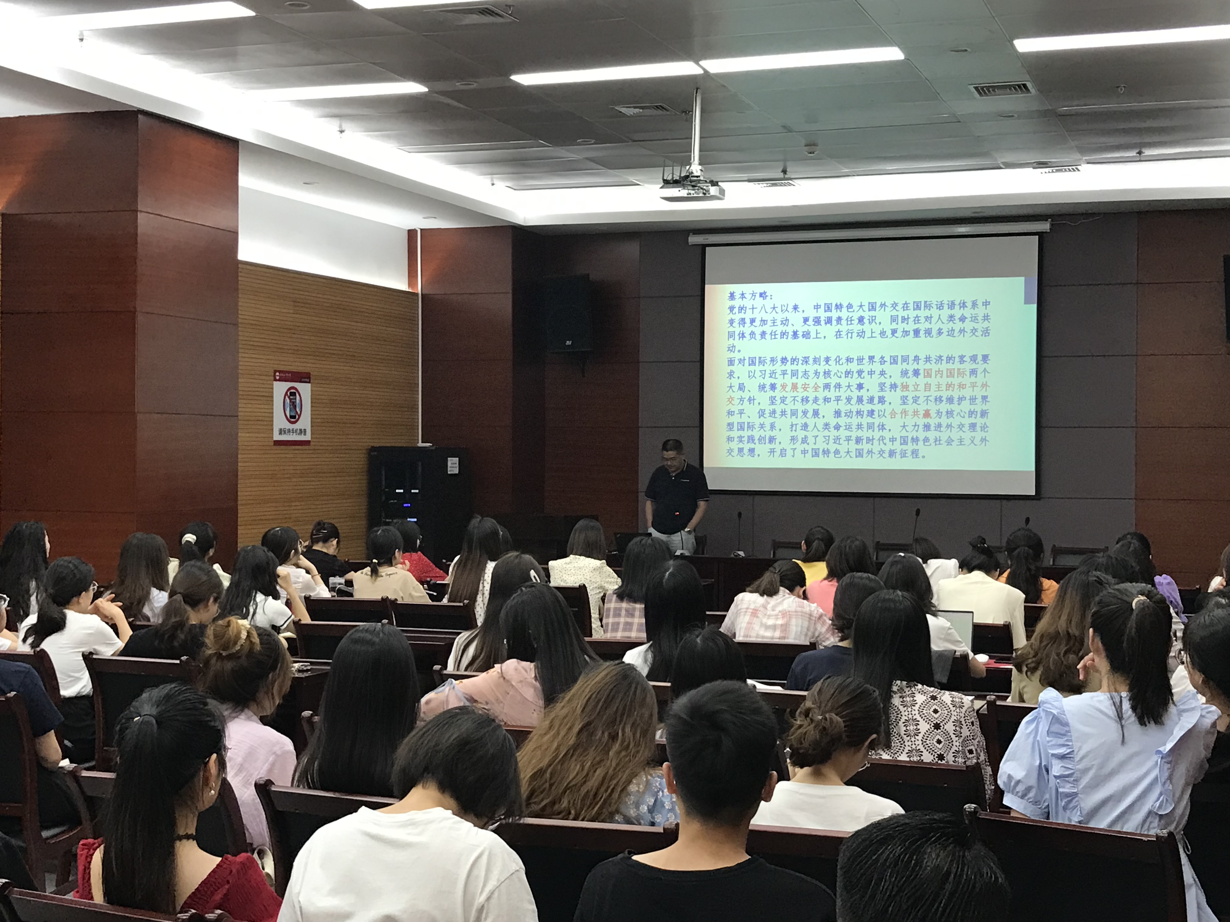 张四红首先简要介绍了当前国际形势,并带领大家回顾了新中国成立以来的中国特色大国外交政策以及所取得的辉煌成就。随后张四红表示,立足中华民族伟大复兴战略全局和世界百年未有之大变局,语言学习者要增强“四个意识”、坚定“四个自信”,带头做到“两个维护”,在学思践悟中坚定理想信念,在奋发有为中践行初心使命,以扎实的专业功底展现外语青年的鲜明本色。