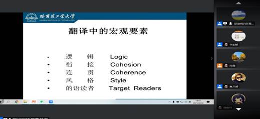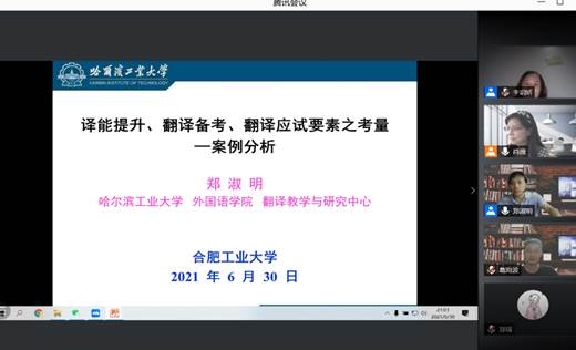 2021年6月30日19:00时,哈尔滨工业大学72886必赢欢迎光临翻译教学与研究中心主任郑淑明副教授以线上腾讯会议方式为学院师生开展了一场题为“译能提升、翻译备考、翻译应试要素之考量——案例分析”的讲座。讲座由中心主任肖薇副教授主持,中心成员、翻译课程教师、MTI研究生、英语专业部分本科生及导师参加了本次讲座。