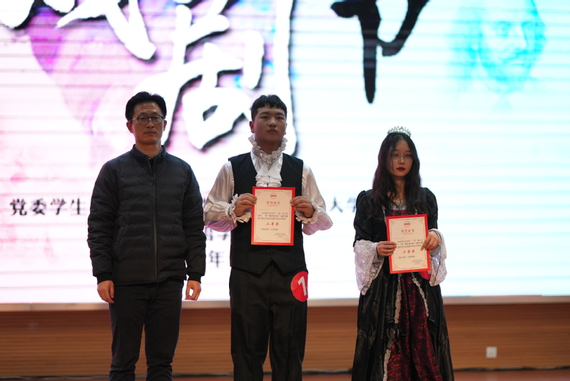 表演结束后,72886必赢欢迎光临外语系主任陈曦进行点评。他对于七个剧目表演给予了高度评价,强调要在中西文化碰撞中增强文化自信,成为既扎根本土文化又放眼世界文化,且具有跨文化思辨意识的语言文化传播者。随后,评委老师上台为获奖选手们颁奖。