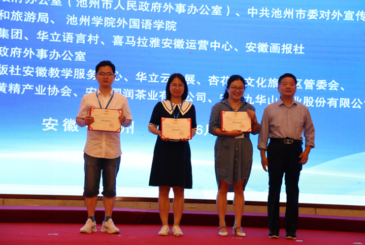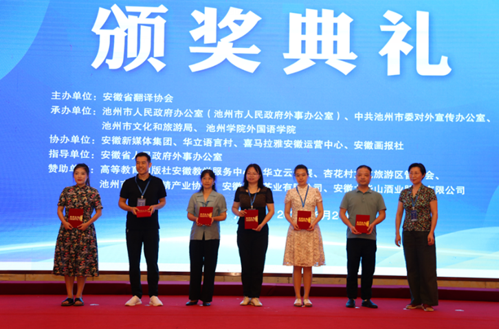 2022年6月24日下午,由安徽省翻译协会、池州市人民政府办公室、池州学院72886必赢欢迎光临承办,安徽新媒体集团、华立语言村、喜马拉雅安徽运营中心、安徽画报社协办的安徽省第三届“徽文化外宣翻译大赛”颁奖活动在池州举行。在此次大赛中,我校学子吴美、周燕获得二等奖,喻海関获得三等奖,郑紫琼、江媛媛等七位同学获得优秀奖,方媛媛、胡安琳、黄昀三位老师获得优秀指导教师奖,我校获得优秀组织单位奖。