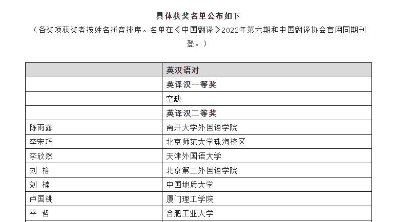 第三十四届韩素音国际翻译大赛于日前公布获奖名单,我院2021级英语笔译专业学生平哲荣获英译汉二等奖(导师:康雷鸣),2020级英语专业本科赵宁同学荣获英译汉优秀奖。两位同学在众多的优秀选手中脱颖而出,在中国翻译舞台上展现了外院学子的风采。平哲同学在一等奖空缺的情况下斩获二等奖,创造了我院学子参加此项赛事的历史最好成绩。