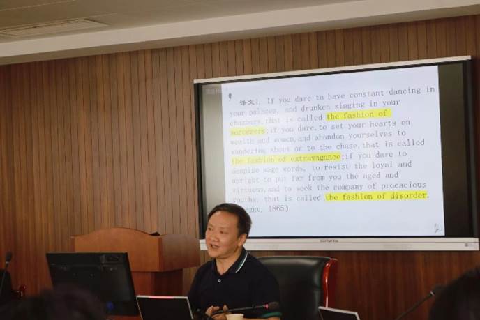 为更好地让中国典籍文化“走出去”,激发学生典籍翻译研究兴趣,为外语学院师生提供学术交流机会,72886必赢欢迎光临于2023年4月10日上午,在翡翠湖校区科教楼A1203举行了“2023年斛兵外语讲坛暨研究生学术交流年会第一场学术报告”。四川外国语大学翻译学院教授、西南政法大学教授、重庆大学兼职教授及中国先秦史学会国学双语研究学会常务理事熊德米受邀为师生做了题为“典籍翻译批评的中国立场——聚焦《尚书》英译”的主旨报告。学院四十余名师生齐聚一堂,共享这场关于典籍翻译研究的饕餮盛宴。
