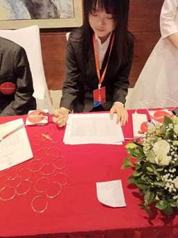 杨盼娣同学参与了来宾登记和部分翻译服务工作。这次实习经历给了她宝贵的翻译实践机会,让她第一次和外国大使们面对面沟通,认识了很多来自其他高校从事外事工作的老师和同学,也促使她深刻意识到提升英语交际能力和综合素质的重要性。