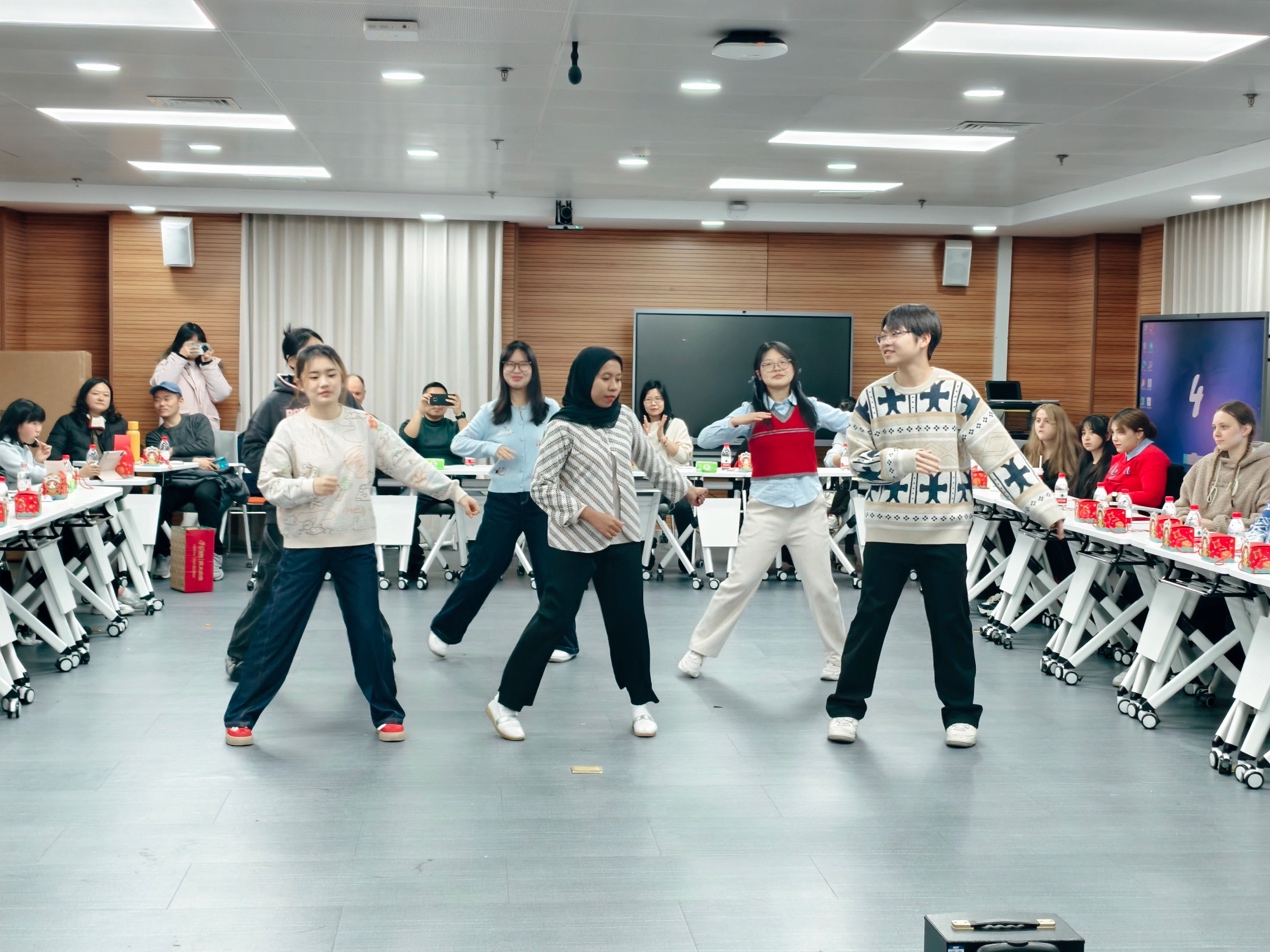 联欢会上,中外同学们合作表演了舞蹈、歌唱、诗朗诵等众多节目,师生们共同参与了趣味小游戏,大家笑语连连,意犹未尽。